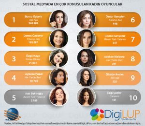 MTM Medya Takip Merkezi’nin Profesyonel Dijital Medya Dinleme Servisi DigiLUP, sosyal medyada en çok konuşulan kadın oyuncuları araştırdı. Bir önceki hafta en çok konuşulan 2.