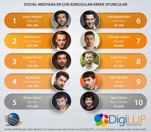 MTM Medya Takip Merkezi’nin profesyonel sosyal medya dinleme servisi Digilup verilerine göre, son hafta yerli dizilerde rol alan erkek oyuncularla ilgili 1,5 milyonu aşkın yorum