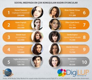 MTM Medya Takip Merkezi’nin profesyonel sosyal medya dinleme servisi Digilup verilerine göre, bu hafta yerli dizilerde rol alan kadın oyuncuların sosyal medya sıralamasında, zirvedeki isimler