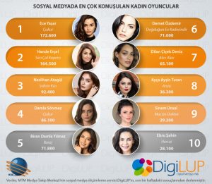 MTM Medya Takip Merkezi’nin profesyonel sosyal medya dinleme servisi Digilup verilerine göre, kadın oyuncular sıralamasında, zirvedeki isim değişti. Çukur dizisindeki rolüyle, hayranlarının ilgisini hiç kaybetmeyen