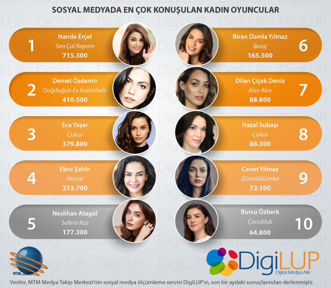 MTM Medya Takip Merkezi, profesyonel sosyal medya dinleme servisi Digilup ile dizilerde rol alan kadın oyuncuların, son 1 aydaki yansımalarını inceledi.
