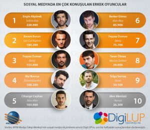 MTM Medya Takip Merkezi’nin profesyonel sosyal medya dinleme servisi Digilup verilerine göre, son 1 ayda en fazla etkileşim sağlayan erkek oyuncu Engin Akyürek oldu. Bundan