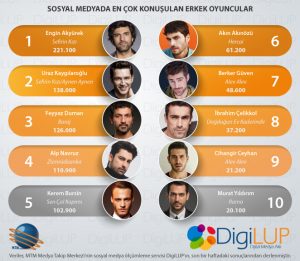 MTM Medya Takip Merkezi’nin, profesyonel sosyal medya dinleme servisi Digilup ile araştırdığı, erkek oyuncuların sosyal medya yansımalarını içeren liste yayınlandı. Rekora koşan iki isim Kanal